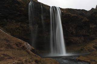 Our first stop was Seljalandsfoss, a waterfall just off of the Ring Road. Its claim to fame is the fact that you can walk behind the water, making it a pretty impressive sight. My poor camera got fairly soaked between the rain and the spray from the falls, but I managed to get a few shots before scrambling up the snow-packed slope on the other side.