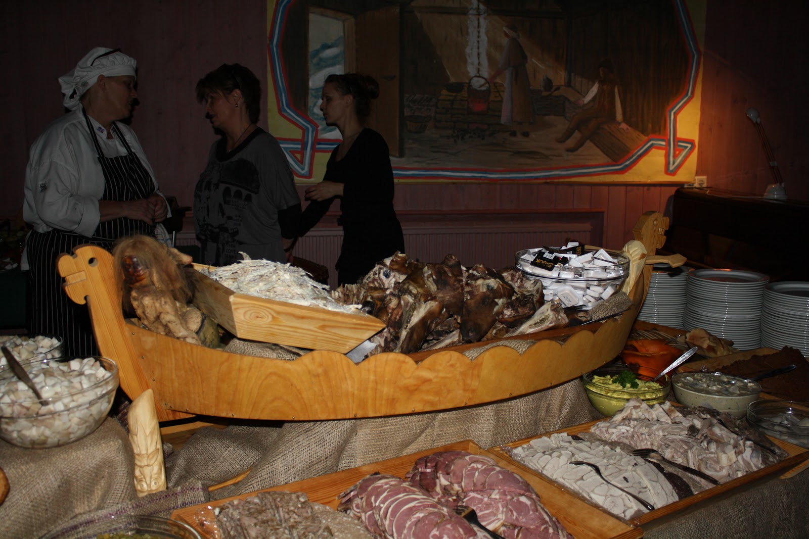 But then the MC ominously broke into English and announced, "Welcome to our Rotten Food Fest!", and the real task of the night began. The buffet was arranged around a Viking longhip with little gnomish talismans scattered here and there. The gnomes would have been a bit disconcerting themselves, had I not been distracted by the large pile of sheep jaws they adorned. These Icelanders don't joke around.