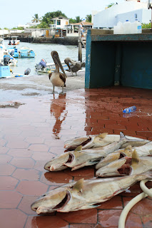But when one talks of Galapagos, one doesn´t talk about lodgings, so enough of the Castle and on to the the real attraction of the islands: the animals. Immortalised by Darwin´s 1835 scientific visit, the islands are most famous for the amazing fauna which exhibits little to no natural fear of man. On our first day we strolled to the fish boat dock where a sea lion was basking in the sun and pelicans rested in the trees a mere meter or so from where we were standing. When the fish came in they skulked around the corner, waiting for a chance to snatch an unattended fish.